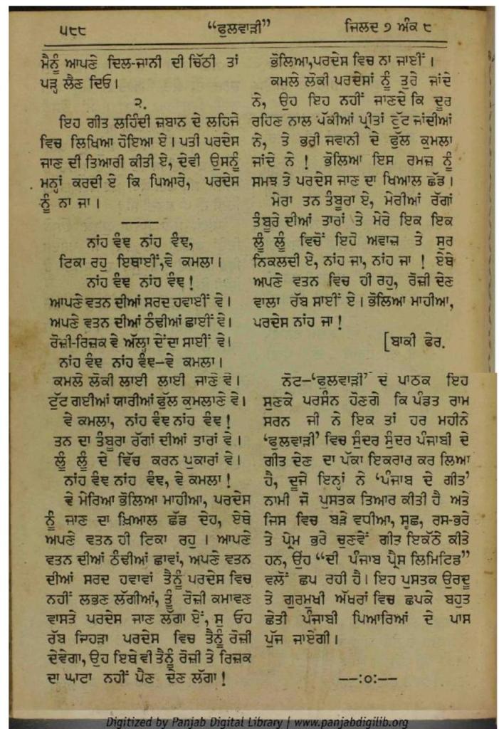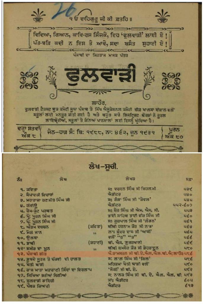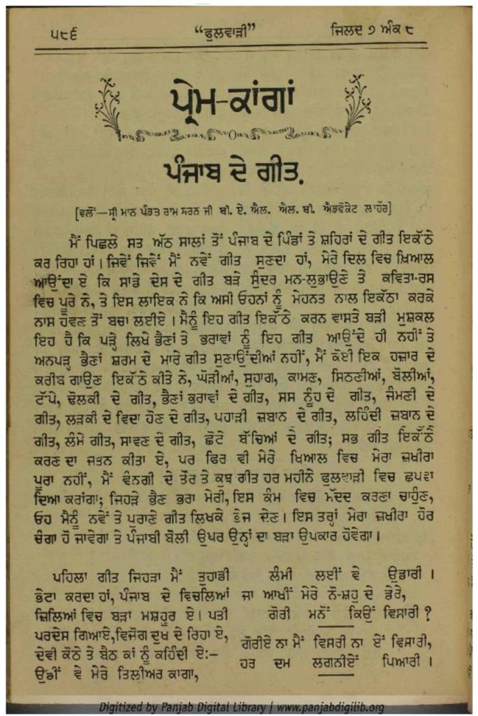 Article – ਪੰਜਾਬੀ ਗੀਤ by Pandit Ram Saran Advocate in Phulwari June 1931 (Digitised by Punjab Digital Library, Chandigarh) ਪੰਜਾਬੀ ਗੀਤ – ਪੰਡਿਤ ਰਾਮ ਸਰਨ ਐਡਵੋਕੇਟDownload Share this: Share on WhatsApp (Opens in new window) WhatsApp Share on X (Opens in new window) X Print (Opens in new window) Print Share on Facebook (Opens in new window) Facebook Email a link to a friend (Opens in new window) Email Share on Pinterest (Opens in new window) Pinterest Share on LinkedIn (Opens in new window) LinkedIn Like Loading...