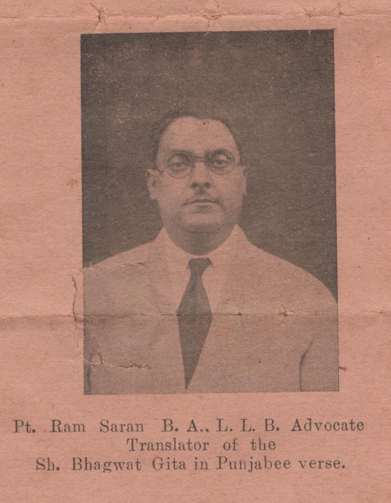 Pandit Ram Saran Advocate/Pandit Ram Saran Das was a prominent figure in the legal and literary circles of Lahore. According to Maula Baksh Khusta’s book ‘Punjabi Shairyon ka Tazkra,’ Pandit Ram Saran Ji started writing verses in Urdu and Hindi by 1918. After reading ‘Heer’ by Vaarish Shah, which he had memorised after reading three times. Later he started writing in his mother tongue, Punjabi.
