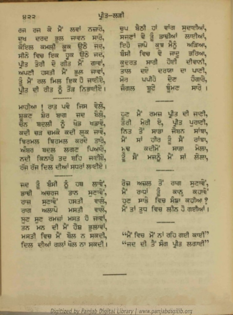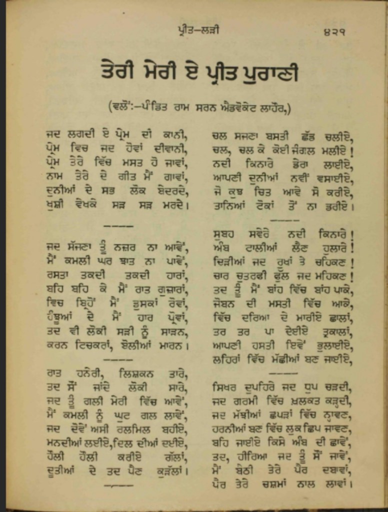 Poem – ਤੇਰੀ-ਮੇਰੀ ਪ੍ਰੀਤ ਪੁਰਾਣੀ Pandit Ram Saran Advocate (1895-1946) published in Preet Lari 1935 Share this: Share on WhatsApp (Opens in new window) WhatsApp Share on X (Opens in new window) X Print (Opens in new window) Print Share on Facebook (Opens in new window) Facebook Email a link to a friend (Opens in new window) Email Share on Pinterest (Opens in new window) Pinterest Share on LinkedIn (Opens in new window) LinkedIn Like Loading...