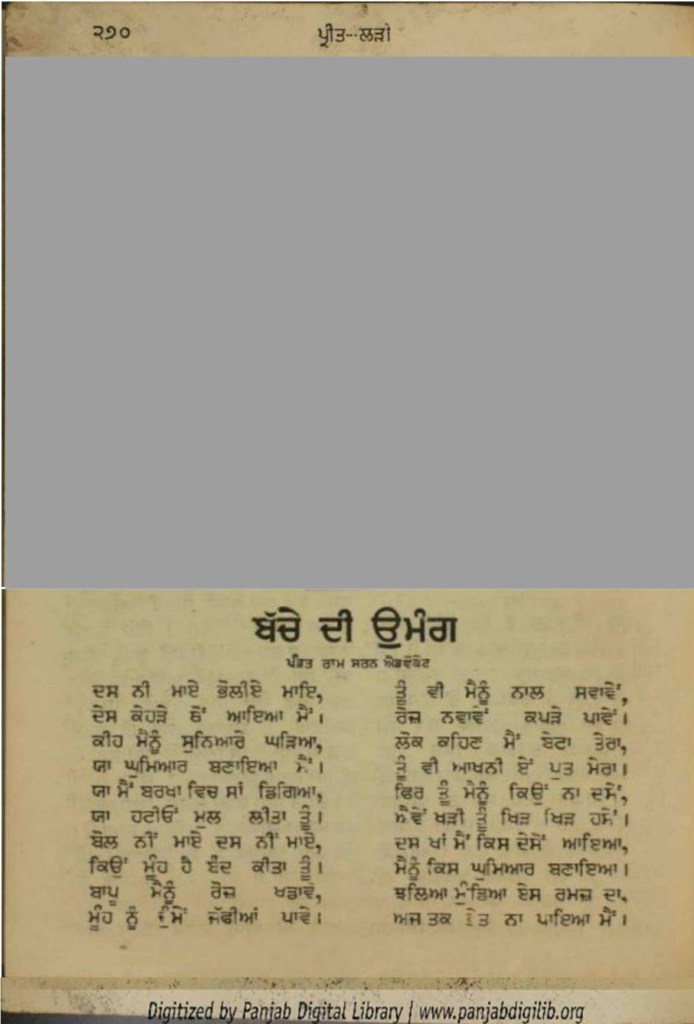 Poem – ਬੱਚੇ ਦੀ ਉਮੰਗ Pandit Ram Saran Advocate (1895-1946) published in Preet Lari December 1935 Share this: Share on WhatsApp (Opens in new window) WhatsApp Share on X (Opens in new window) X Print (Opens in new window) Print Share on Facebook (Opens in new window) Facebook Email a link to a friend (Opens in new window) Email Share on Pinterest (Opens in new window) Pinterest Share on LinkedIn (Opens in new window) LinkedIn Like Loading...