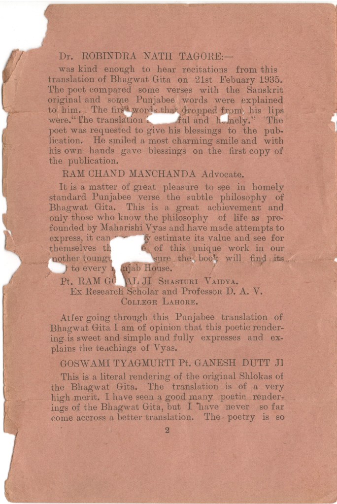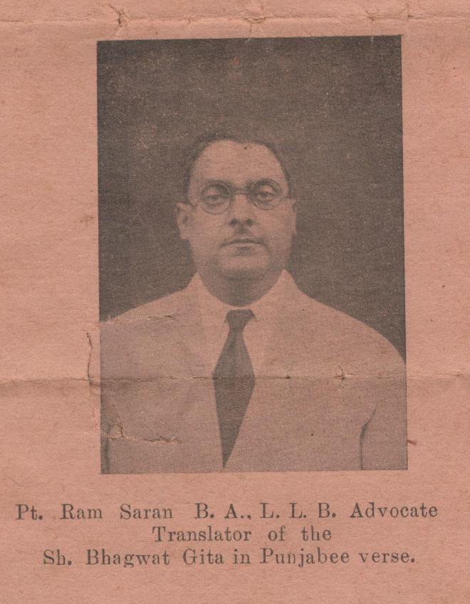 Srimad Bhagwat Gita in Punjabi (in Devanagari Script) was translated by Pandit Ram Saran Advocate a resident of Lahore (Un-divided India). He was a practicing Lawyer in the High Court and lived in Anarkali Bazar. He was an advocate of the revolutionaries.